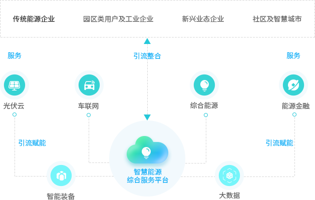 以优质能源服务为基石,发挥能源企业海量用户资源优势,打造涵盖政府、终端客户、产业链上下游的智慧综合能源系统,提供信息对接、供需匹配、交易撮合等服务,为新兴业务引流用户;加强设备监控、电网互动、账户管理、客户服务等共性能力中心建设,为能源企业和新兴业务主体赋能,支撑“企业级、区域级、园区级”服务需求;其中,智慧能源综合服务平台是智慧综合能源服务的核心载体。